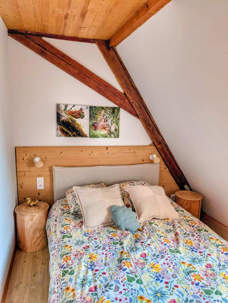 Nichée côté jardin, la chambre Fleur de Noisetier offre un cocon apaisant où la nature s’invite jusque dans les moindres détails. Son lit simple, accompagné d’une armoire pratique, vous assure un confort douillet pour un séjour en toute sérénité. La décoration, inspirée par l’univers charmant de l’écureuil, mêle tons naturels et petites touches boisées, créant une atmosphère chaleureuse et authentique. Depuis la fenêtre, la vue sur le jardin prolonge cette parenthèse nature… comme une promenade au cœur d’un bois paisible.